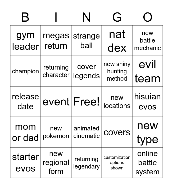 This bingo card has a free space and 24 words: new pokemon, new regional form, cover legends, starter evos, new battle mechanic, gym leader, champion, megas return, new locations, animated cinematic, new shiny hunting method, release date, covers, new type, returning character, customization options shown, hisuian evos, strange ball, evil team, event, online battle system, mom or dad, nat dex and returning legendary.