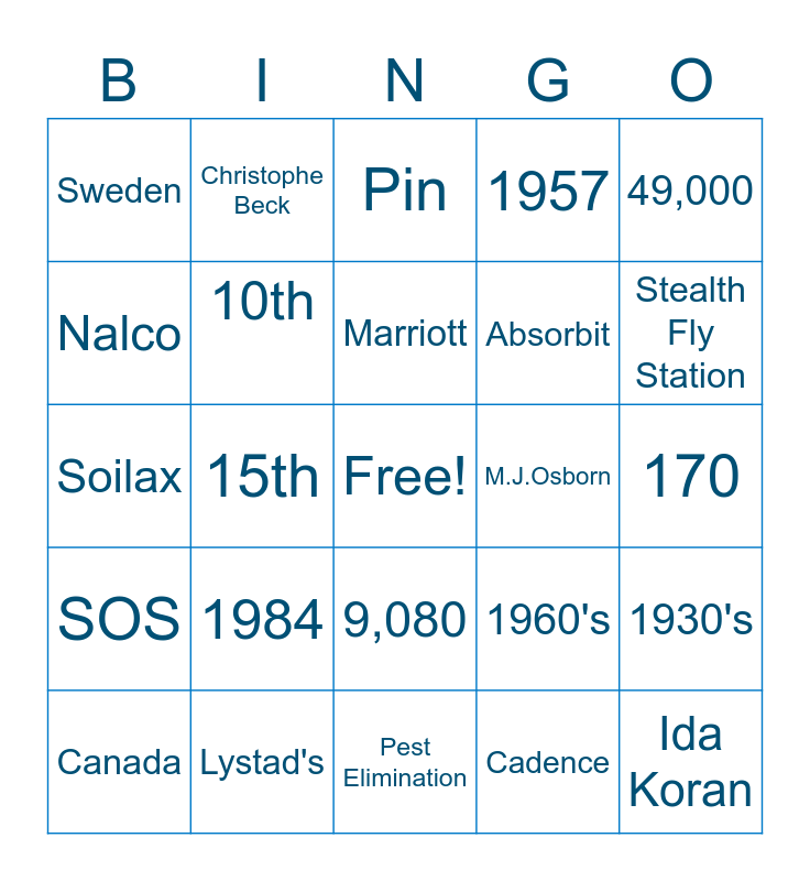 This bingo card has a free space and 24 words: 1984, Lystad's, Marriott, Canada, 49,000, Sweden, Nalco, Christophe Beck, M.J.Osborn, 9,080, Absorbit, Soilax, 1960's, 1930's, 10th, Cadence, 170, Pin, Stealth Fly Station, 15th, Ida Koran, SOS, 1957 and Pest Elimination.
