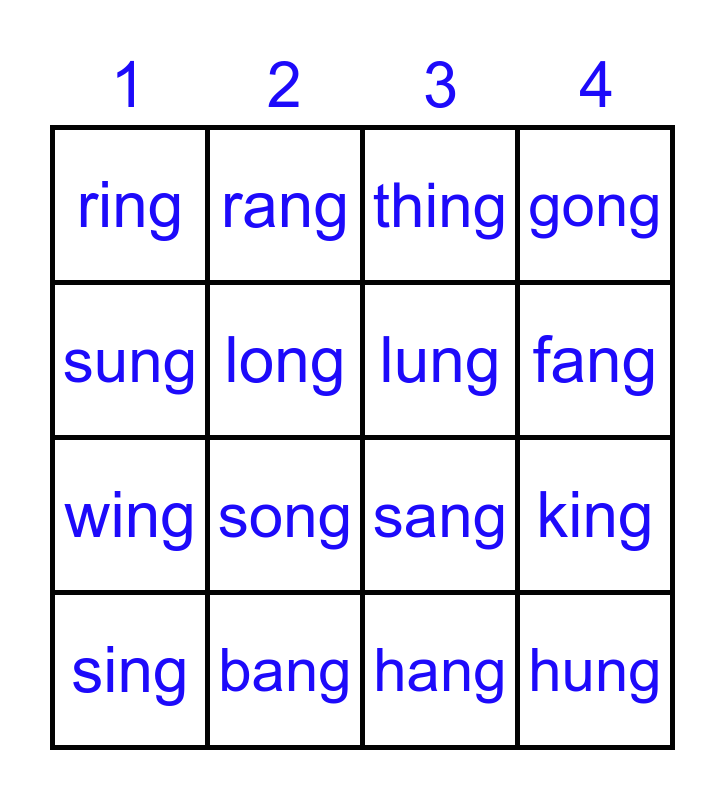 This bingo card has 16 words: bang, king, thing, ring, wing, rang, sang, hang, sung, long, sing, gong, song, fang, lung and hung.