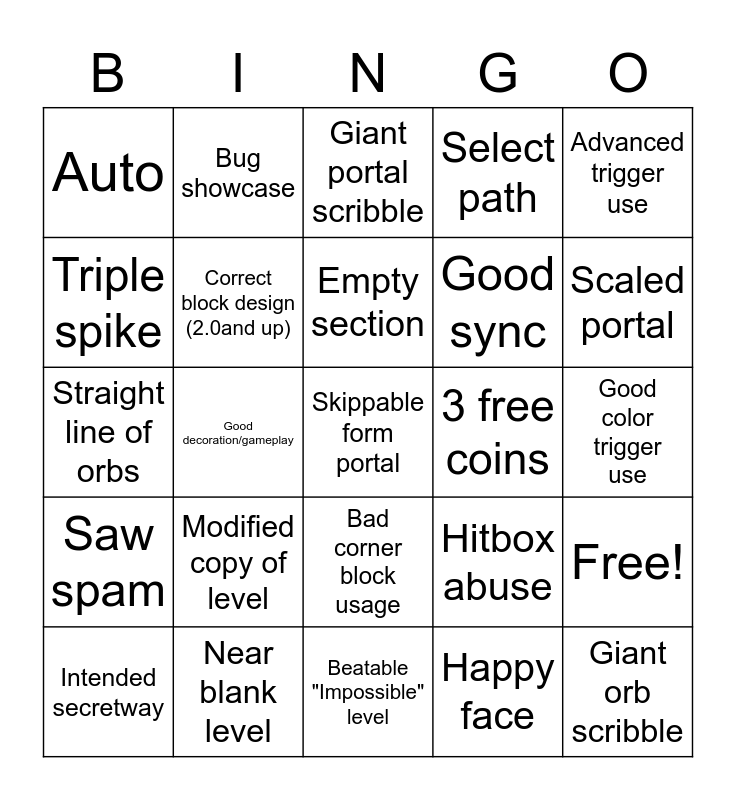 This bingo card has 26 words: Bad corner block usage, Happy face, Empty section, Near blank level, Advanced trigger use, Auto, Triple spike, Bug showcase, Good color trigger use, Hitbox abuse, Good sync, Straight line of orbs, Free!, Intended secretway, Good decoration/gameplay, Floating spikes, Select path, Saw spam, Giant portal scribble, Skippable form portal, Scaled portal, Beatable "Impossible" level, 3 free coins, Modified copy of level, Correct block design (2.0and up) and Giant orb scribble.