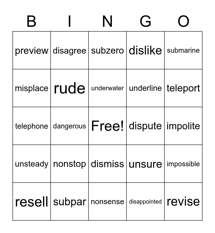 This bingo card has a free space and 44 words: rewrite, revise, revisit, resell, dishonest, disappointed, subzero, subterrain, submarine, subpar, dislike, dispute, dismiss, nonstop, nonfat, nonsense, renew, telephone, telegraph, teleport, disagree, telescope, precaution, preview, preserve, impolite, impertinent, immodest, unsure, unsteady, unnatural, impossible, believeable, unsafe, dangerous, misspell, underground, underwear, underwater, misplace, underline, prehistoric, rude and safeguard.