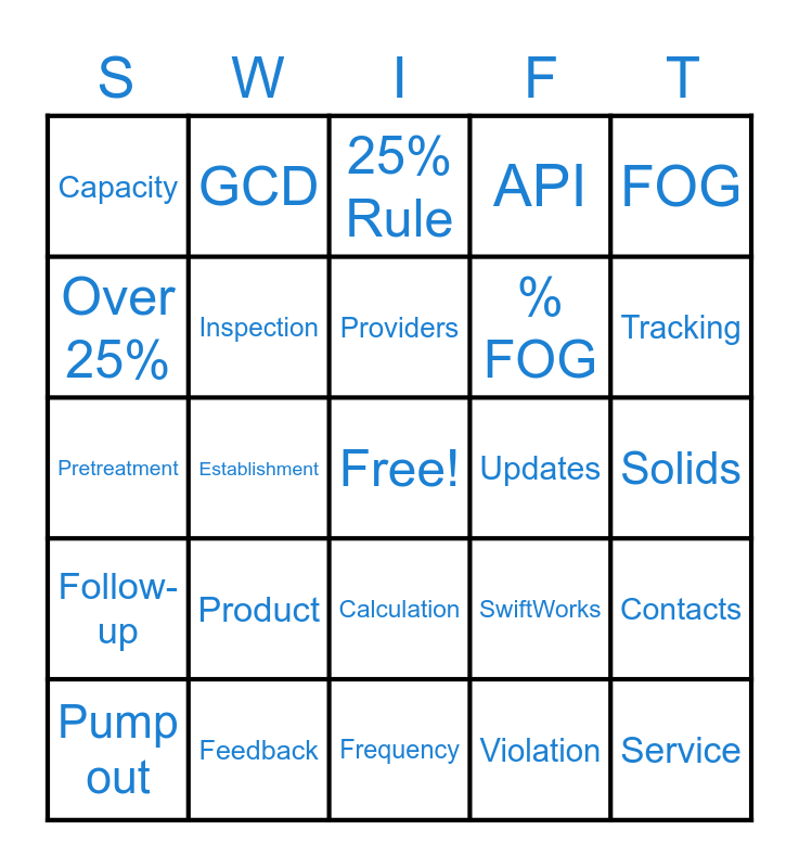 This bingo card has a free space and 29 words: Pump out, Grease, Establishment, Trap, Capacity, 25% Rule, Inspection, Product, Updates, Feedback, Solids, Service, Frequency, Violation, Tracking, Conference, Calculation, Follow-up, FOG, Pretreatment, SwiftWorks, Sludge Judge, % FOG, Over 25%, API, GCD, Contacts, Providers and feature request.