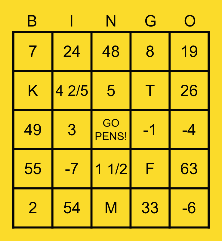 This bingo card has a free space and 39 words: 1, 3 1/6, 3/4, 4 2/5, 2, 1 1/2, 5, 4, 19, 55, 3, 8, -6, -4, -1, -7, 9, 7, A, F, K, M, T, 26, 18, 43, 25, 50, 45, 24, 30, 20, 48, 54, 33, 27, 63, 49 and 72.