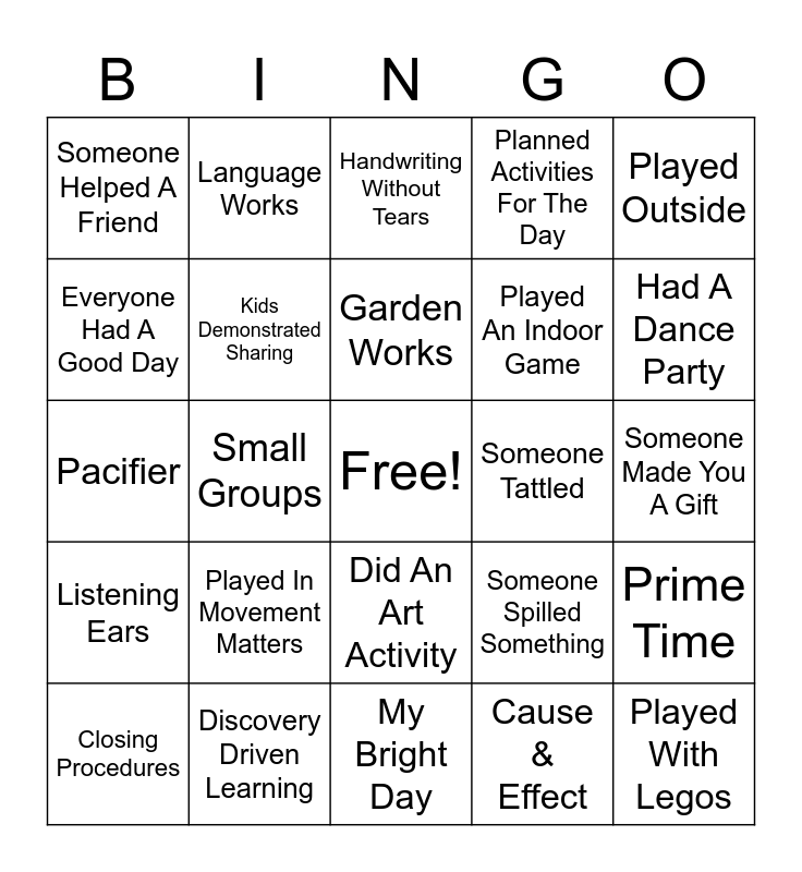 This bingo card has a free space and 39 words: Wrote An Incident Report, Someone Told An Obvious Lie, Had To Talk To a Parent, Kids Demonstrated Sharing, Closing Procedures, Did An Art Activity, Garden Works, Someone's Birthday, Played Outside, Listening Ears, Small Groups, Planned Activities For The Day, Played With Legos, Someone Made You A Gift, Someone Tattled, Played In Movement Matters, Everyone Stacked Their Chairs, Someone Helped A Friend, NAEYC, Someone Spilled Something, Everyone Had A Good Day, My Bright Day, Played An Indoor Game, Had A Dance Party, Better Together, Signature Practices, Summer Camp, Reggio Emilia, Heart Principles, Language Works, World At Your Fingertips, Diaper Changing, Handwriting Without Tears, Discovery Driven Learning, Cause & Effect, Stem, Prime Time, Pacifier and Potty Training.