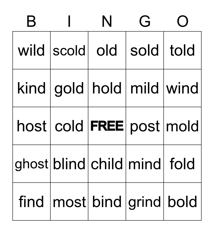 This bingo card has a free space and 24 words: blind, most, hold, find, told, wild, kind, scold, post, child, mild, host, mind, fold, gold, grind, mold, old, wind, cold, bold, ghost, sold and bind.