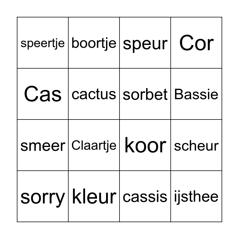 This bingo card has 16 words: kleur, scheur, speur, speertje, smeer, boortje, koor, cassis, Cas, cactus, sorry, Cor, Claartje, Bassie, sorbet and ijsthee.