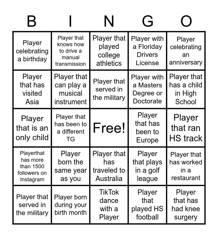 This bingo card has a free space and 24 words: Player born the same year as you, Player born during your birth month, Player that served in the military, Player that served in the military, Player celebrating an anniversary, Player celebrating a birthday, Player that has visited Asia, Player that knows how to drive a manual transmission, Player that has been to Europe, Player that has traveled to Australia, Player with a Masters Degree or Doctorate, Player that is an only child, Player that plays in a golf league, Player that has worked in a restaurant, Player that can play a musical instrument, Player that played HS football, Player that ran HS track, Player that played college athletics, Player that has a child in High School, Player that has been to a different TG, Player that has had knee surgery, Playerthat has more than 1500 followers on Instagram, Player with a Floriday Drivers License and TikTok dance with a Player.