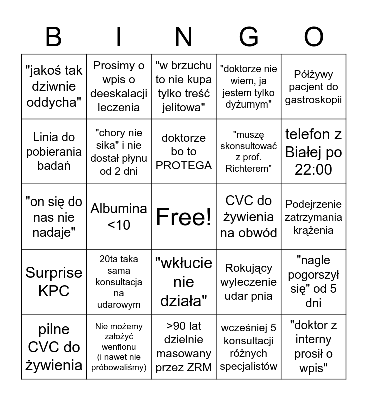 This bingo card has a free space and 24 words: 20ta taka sama konsultacja na udarowym, Nie możemy założyć wenflonu (i nawet nie próbowaliśmy), doktorze bo to PROTEGA, pilne CVC do żywienia, Półżywy pacjent do gastroskopii, "jakoś tak dziwnie oddycha", Linia do pobierania badań, Prosimy o wpis o deeskalacji leczenia, CVC do żywienia na obwód, "wkłucie nie działa", "muszę skonsultować z prof. Richterem", "on się do nas nie nadaje", Rokujący wyleczenie udar pnia, "nagle pogorszył się" od 5 dni, "chory nie sika" i nie dostał płynu od 2 dni, wcześniej 5 konsultacji różnych specjalistów, Podejrzenie zatrzymania krążenia, "w brzuchu to nie kupa tylko treść jelitowa", telefon z Białej po 22:00, Albumina <10, "doktor z interny prosił o wpis", Surprise KPC, "doktorze nie wiem, ja jestem tylko dyżurnym" and >90 lat dzielnie masowany przez ZRM.