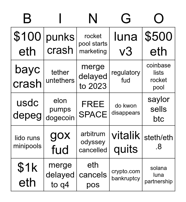 This bingo card has a free space and 24 words: gox fud, merge delayed to q4, merge delayed to 2023, $1k eth, $500 eth, $100 eth, bayc crash, punks crash, do kwon disappears, arbitrum odyssey cancelled, regulatory fud, usdc depeg, vitalik quits, steth/eth .8, tether untethers, crypto.com bankruptcy, saylor sells btc, rocket pool starts marketing, coinbase lists rocket pool, elon pumps dogecoin, solana luna partnership, lido runs minipools, luna v3 and eth cancels pos.
