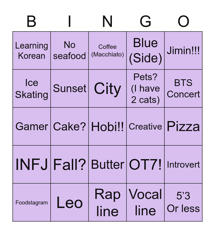 This bingo card has 25 words: Fall?, Rap line, City, Foodstagram, Jimin!!!, Learning Korean, Ice Skating, No seafood, Creative, Butter, Pets? (I have 2 cats), Gamer, OT7!, Introvert, Sunset, 5’3 Or less, Pizza, Coffee (Macchiato), BTS Concert, Cake?, Hobi!!, Leo, INFJ, Blue (Side) and Vocal line.