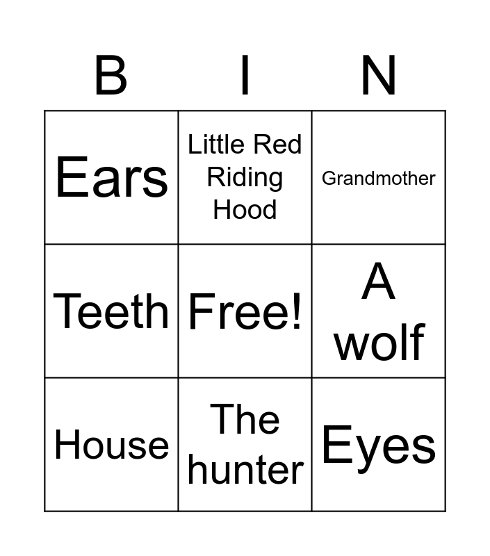 This bingo card has a free space and 8 words: A wolf, Grandmother, Little Red Riding Hood, House, Ears, Eyes, Teeth and The hunter.