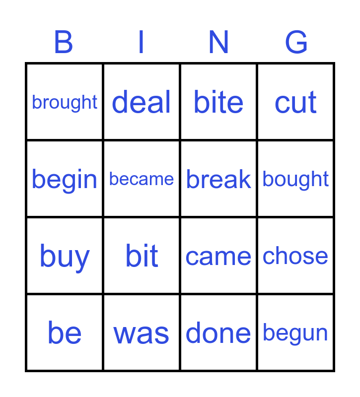 This bingo card has 16 words: was, chose, bite, brought, buy, deal, came, done, begin, became, be, cut, bit, bought, break and begun.