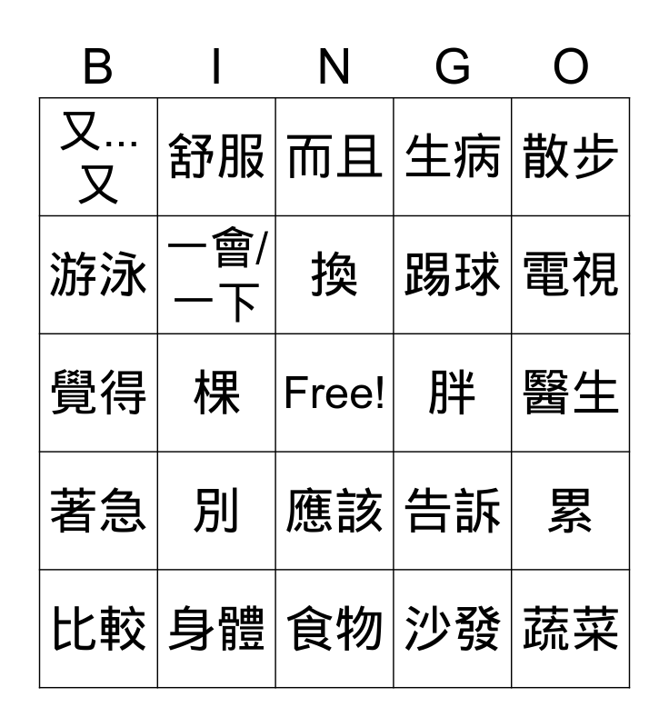 This bingo card has a free space and 29 words: 比較, 塊, 棵, 所以, 又...又, 而且, 一會/一下, 別, 胖, 身體, 醫生, 蔬菜, 食物, 沙發, 電視, 擔心, 應該, 著急, 散步, 覺得, 告訴, 結尾, 踢球, 游泳, 生病, 舒服, 累, 換 and 小孩.