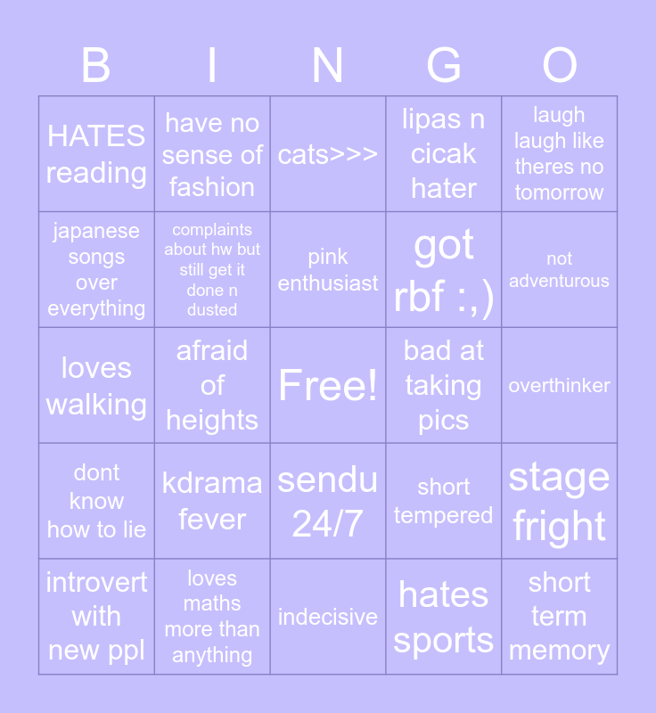 This bingo card has a free space and 24 words: kdrama fever, loves maths more than anything, pink enthusiast, introvert with new ppl, laugh laugh like theres no tomorrow, HATES reading, japanese songs over everything, have no sense of fashion, bad at taking pics, sendu 24/7, got rbf :,), loves walking, short tempered, stage fright, complaints about hw but still get it done n dusted, hates sports, overthinker, cats>>>, not adventurous, afraid of heights, short term memory, dont know how to lie, lipas n cicak hater and indecisive.