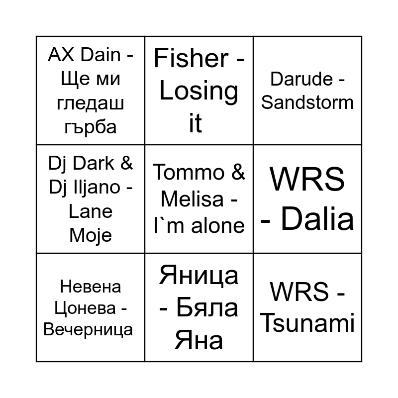 This bingo card has a free space and 8 words: WRS - Dalia, Darude - Sandstorm, Fisher - Losing it, Невена Цонева - Вечерница, AX Dain - Ще ми гледаш гърба, WRS - Tsunami, Dj Dark & Dj Iljano - Lane Moje and Яница - Бяла Яна.