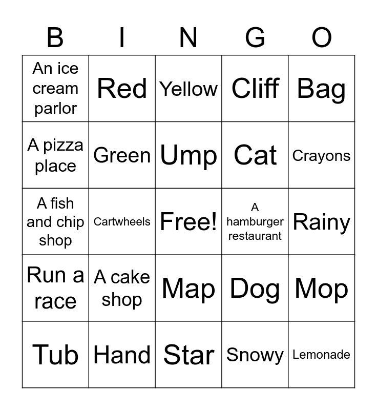 This bingo card has a free space and 24 words: A cake shop, Hand, Ump, Tub, Bag, An ice cream parlor, A pizza place, Red, A hamburger restaurant, Map, Cat, A fish and chip shop, Dog, Mop, Green, Snowy, Rainy, Yellow, Crayons, Cartwheels, Lemonade, Run a race, Cliff and Star.