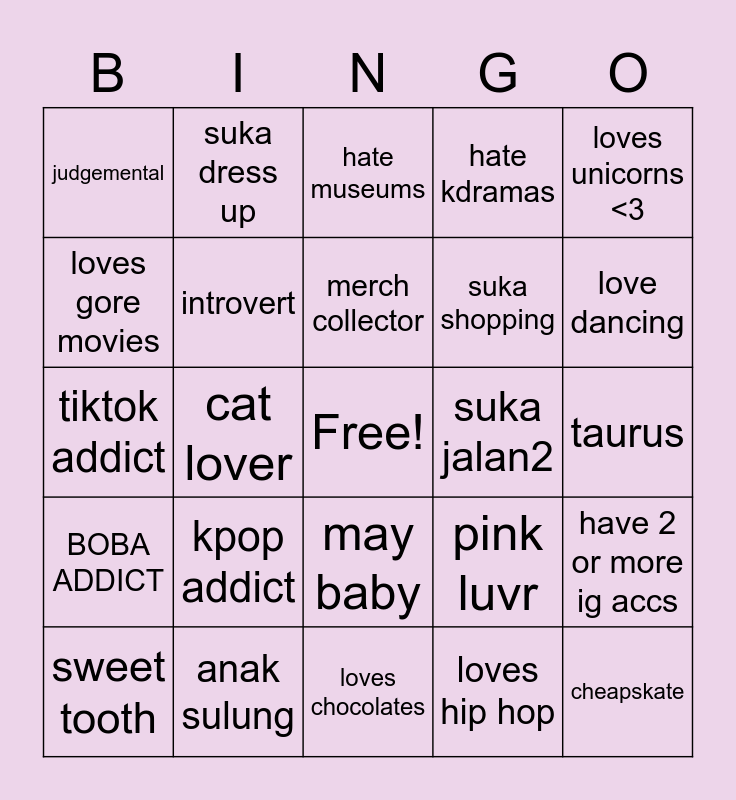 This bingo card has a free space and 24 words: kpop addict, anak sulung, merch collector, sweet tooth, loves unicorns <3, judgemental, loves gore movies, suka dress up, suka jalan2, may baby, suka shopping, tiktok addict, pink luvr, have 2 or more ig accs, introvert, loves hip hop, taurus, hate museums, love dancing, cat lover, cheapskate, BOBA ADDICT, hate kdramas and loves chocolates.