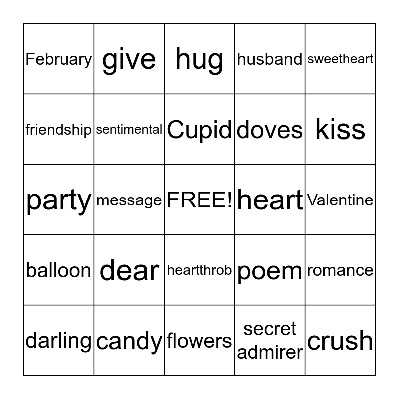 This bingo card has a free space and 24 words: dear, candy, Cupid, darling, sweetheart, February, friendship, give, heart, heartthrob, doves, party, poem, romance, sentimental, secret admirer, Valentine, hug, kiss, message, crush, balloon, husband and flowers.