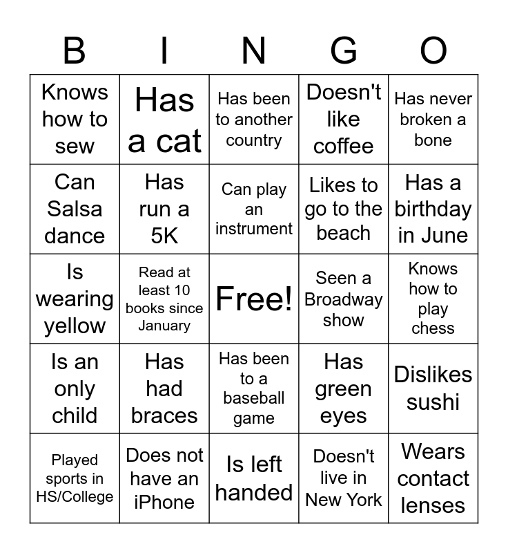 This bingo card has a free space and 24 words: Has had braces, Does not have an iPhone, Can play an instrument, Played sports in HS/College, Has never broken a bone, Knows how to sew, Can Salsa dance, Has a cat, Seen a Broadway show, Has been to a baseball game, Likes to go to the beach, Is wearing yellow, Has green eyes, Dislikes sushi, Has run a 5K, Doesn't live in New York, Knows how to play chess, Has been to another country, Has a birthday in June, Read at least 10 books since January, Wears contact lenses, Is an only child, Doesn't like coffee and Is left handed.