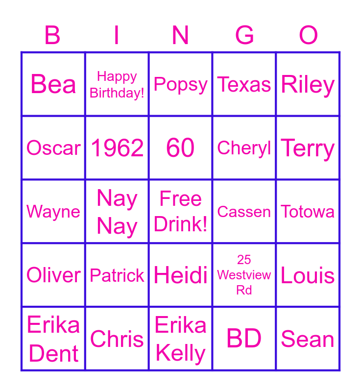 This bingo card has a free space and 24 words: Patrick, Chris, 60, Erika Dent, Riley, Bea, Oscar, Happy Birthday!, Cassen, Heidi, Cheryl, Wayne, 25 Westview Rd, Louis, 1962, BD, Totowa, Popsy, Terry, Nay Nay, Sean, Oliver, Texas and Erika Kelly.