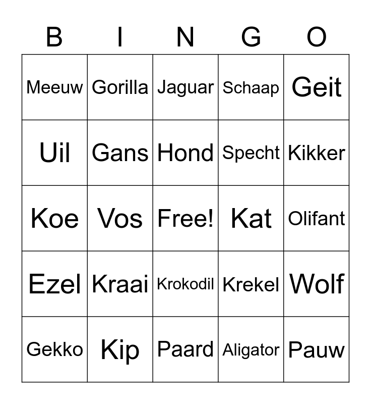 This bingo card has a free space and 34 words: Adelaar, Aligator, Dolfijn, Eend, Ezel, Gans, Geit, Gekko, Gorilla, Haan, Hond, Jaguar, Kalkoen, Kameel, Kat, Kikker, Kip, Koe, Kraai, Krekel, Krokodil, Leeuw, Meeuw, Olifant, Paard, Pauw, Schaap, Slang, Specht, Uil, Varken, Vos, Wolf and Zeehond.