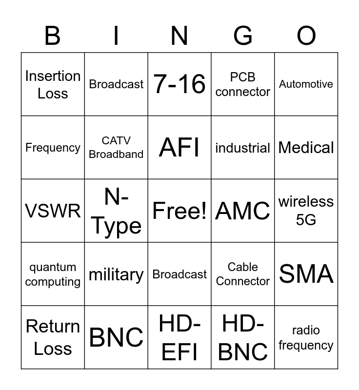 This bingo card has a free space and 24 words: military, BNC, AFI, Return Loss, Automotive, Insertion Loss, Frequency, Broadcast, AMC, Broadcast, industrial, VSWR, Cable Connector, SMA, CATV Broadband, HD-BNC, wireless 5G, 7-16, Medical, N-Type, radio frequency, quantum computing, PCB connector and HD-EFI.