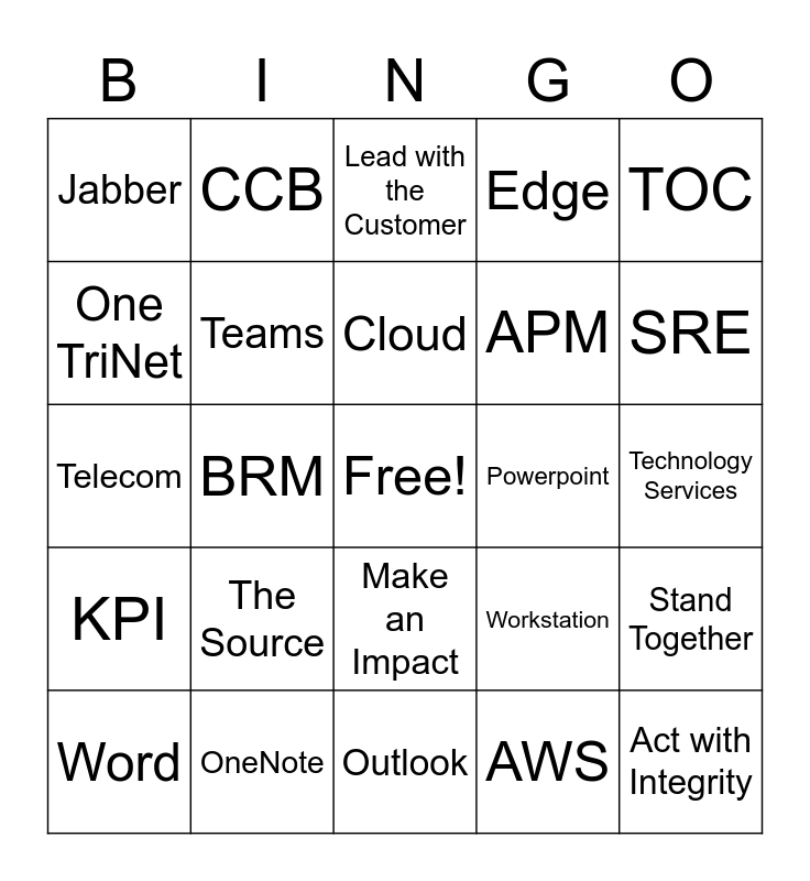 This bingo card has a free space and 42 words: TSO, Cloud, ServiceNow, The Source, AWS, Stand Together, Act with Integrity, Be Incredible, Lead with the Customer, Make an Impact, Technology Services, SRE, BRM, TOC, Zenefits, Workstation, Unix and Windows, Telecom, Appdeploy, CCB, One TriNet, BUILD Week, CRGs, Jabber, iOffice, Anaplan, APM, VDI, Mac, Windows, CTE, KPI, Teams, Outlook, Excel, Word, OneNote, Powerpoint, OneDrive, Chrome, Edge and Azure.