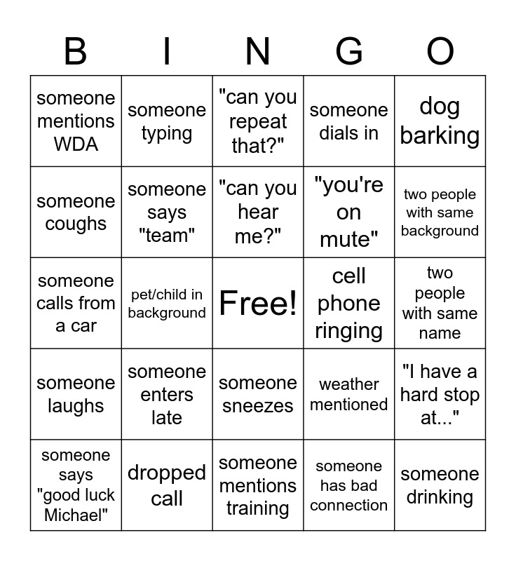 This bingo card has a free space and 24 words: someone enters late, dropped call, "can you hear me?", someone says "good luck Michael", dog barking, someone mentions WDA, someone coughs, someone typing, cell phone ringing, someone sneezes, "you're on mute", someone calls from a car, weather mentioned, "I have a hard stop at...", someone says "team", someone has bad connection, two people with same name, "can you repeat that?", two people with same background, pet/child in background, someone drinking, someone laughs, someone dials in and someone mentions training.