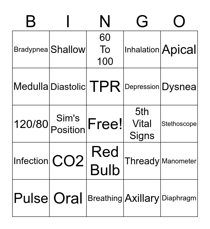 This bingo card has a free space and 24 words: CO2, Oral, TPR, Pulse, Apical, Bradypnea, Medulla, Shallow, 5th Vital Signs, Red Bulb, Depression, 120/80, Thready, Manometer, Diastolic, Axillary, Stethoscope, 60 To 100, Dysnea, Sim's Position, Diaphragm, Infection, Inhalation and Breathing.