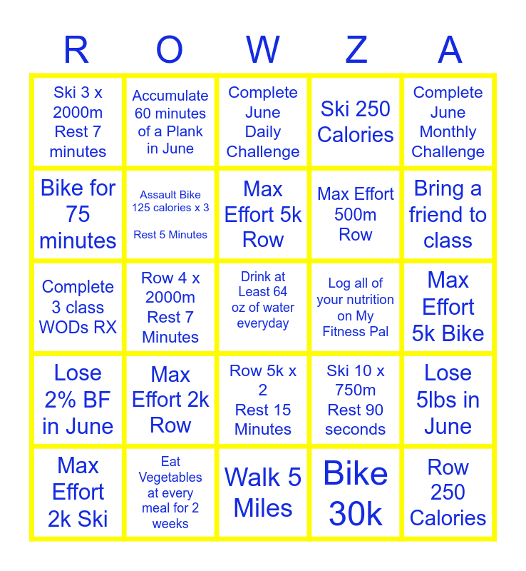This bingo card has a free space and 24 words: Max Effort 2k Row, Eat Vegetables at every meal for 2 weeks, Max Effort 5k Row, Max Effort 2k Ski, Complete June Monthly Challenge, Ski 3 x 2000m Rest 7 minutes, Bike for 75 minutes, Accumulate 60 minutes of a Plank in June, Log all of your nutrition on My Fitness Pal, Row 5k x 2 Rest 15 Minutes, Max Effort 500m Row, Complete 3 class WODs RX, Ski 10 x 750m Rest 90 seconds, Lose 5lbs in June, Assault Bike 125 calories x 3 Rest 5 Minutes, Bike 30k, Max Effort 5k Bike, Complete June Daily Challenge, Bring a friend to class, Row 4 x 2000m Rest 7 Minutes, Row 250 Calories, Lose 2% BF in June, Ski 250 Calories and Walk 5 Miles.