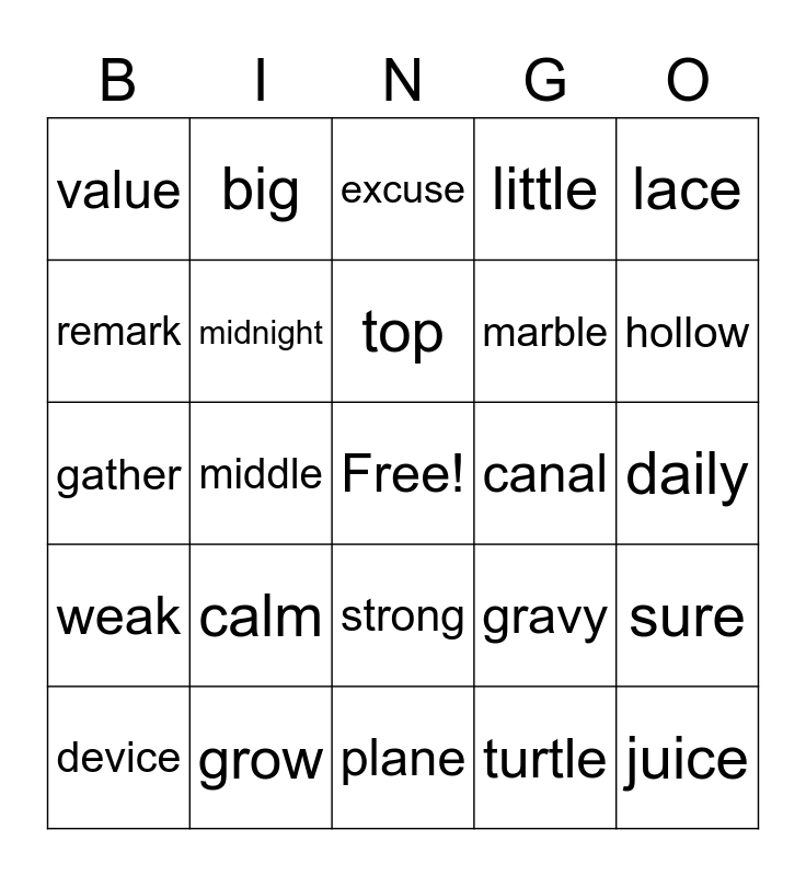 This bingo card has a free space and 29 words: device, mention, middle, use, value, excuse, midnight, calm, canal, grow, daily, juice, plane, turtle, hollow, swim, strong, weak, lace, gather, gravy, hatch, marble, remark, little, big, sure, top and bottom.