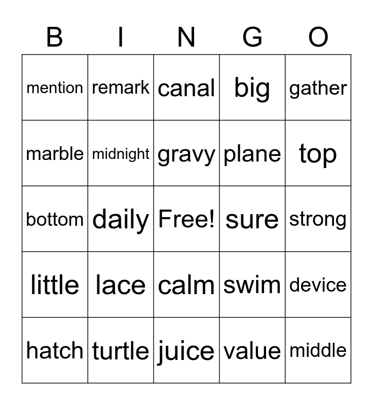 This bingo card has a free space and 29 words: hatch, excuse, daily, grow, mention, canal, midnight, lace, sure, turtle, strong, middle, juice, value, top, weak, calm, little, gather, bottom, swim, use, plane, marble, big, remark, device, gravy and hollow.