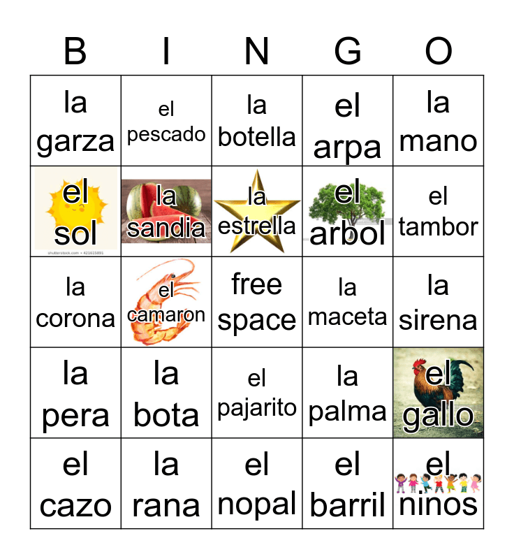 This bingo card has 14 images, a free space and 44 words: la campana, el ninos, el venado, el cazo, la bandera, el barril, la botella, la escalera, la mano, la rana, el arpa, la maceta, el pajarito, la bota, el valiente, el nopal, el melon, la corona, el diablito, el tambor, el pescado, el gorrito, el corazon, la garza, la dama, la sirena, la luna, el musico, la palma, la pera, el pino, el gallo, la rosa, el alacran, el camaron, la calavera, el soldado, la aranya, la estrella, el sol, el arbol, el paraguas, la sandia and el mundo.