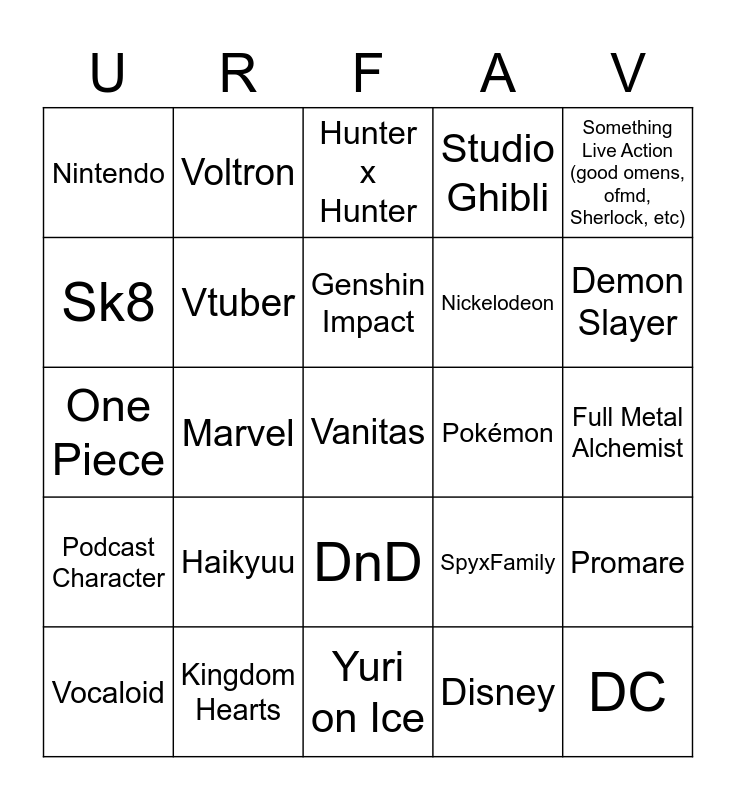 This bingo card has 49 words: Toilet Bound Hanako Kun, Vanitas, Bungo Stray Dog, Yuri on Ice, Haikyuu, Free!!, Voltron, Ya Boy Kongming, Sk8, My Hero Academia, Vtuber, Studio Ghibli, Promare, SpyxFamily, Jujutsu Kaisen, One Punch Man, Genshin Impact, Pokémon, MXTX, Something Live Action (good omens, ofmd, Sherlock, etc), Marvel, Disney, Nintendo, Nickelodeon, Cartoon Network, Demon Slayer, Vocaloid, League of Legends, DnD, Podcast Character, General Video Game (among us, resident evil, halo, etc), Soul Eater, Attack on Titan, Horror Movies, Kingdom Hearts, Persona, Danganrompa, Death Note, Full Metal Alchemist, Current children's cartoon (Steven universe, owl house, gravity falls), Inuyasha, Naruto, DC, Bleach, One Piece, Hunter x Hunter, Animal Crossing, Star Wars and Jojo's Bizarre Adventure.
