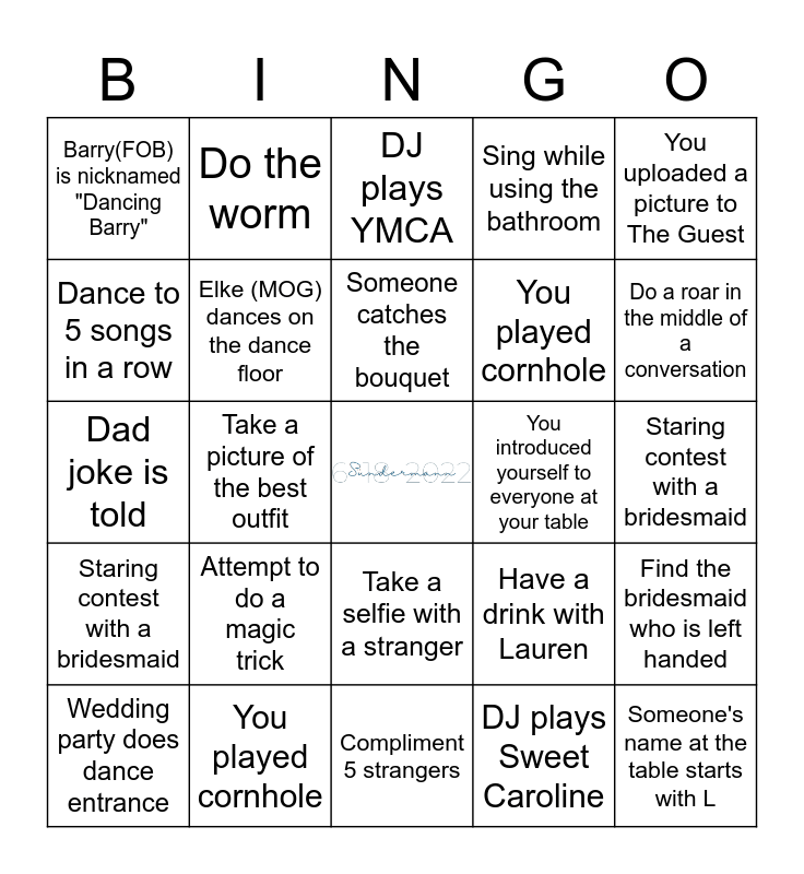 This bingo card has a free space and 150 words: Cake smashed in face, Wedding party does dance entrance, Barry (FOB) cries during toast, Lauren trips during first dance, DJ plays Cupid Shuffle, Someone does the worm, Someone catches the bouquet, No one catches the bouquet, You signed the guestbook, Child cries, Bridesmaid changes their shoes, Someone shotguns a beer, You played cornhole, DJ plays Cotton Eye Joe, Elke (MOG) dances on the dance floor, Toasted Champagne, Someone spills their drink, Cole makes a speech, DJ plays Low by FloRida, You dance with a member of the wedding party, Flashmob dance, You got on the dance floor, Wedding cake flavor is chocolate, Wedding cake flavor is vanilla, Someone did a cartwheel, You see a wild animal, You see a party animal, You introduced yourself to everyone at your table, James (Best Man) does a shot with Barry (FOB), Megan (MOH) cries during toast, DJ plays Sweet Caroline, Lauren choreographs a dance to Blinding Lights, Two people are wearing the same outfit, Cole dances with Whitney(MOB), Barry(FOB) is nicknamed "Dancing Barry", You order a Sün of a Peach, You order a VodkcranMarry Me!, You had a glass of wine, Someone's name at the table starts with L, Someone's name at the table starts with C, You high five someone at another table, You ask someone at another table to dance, You uploaded a picture to The Guest, Find a guest that speaks German, Take a picture of the best outfit, Get a new phone number, Someone's name at the table starts with S, Dance with Elke (MOG), Staring contest with a bridesmaid, Howl at the moon, Start a conga line, Take a selfie with a stranger, Dad joke is told, Do a roar in the middle of a conversation, Silly face photo with your whole table, Start a slow clap, Start the wave, Find the bridesmaid who is left handed, Sparkler Tunnel, DJ plays Dancing Queen, DJ plays YMCA, Attempt to do a magic trick, Dance to 5 songs in a row, Make Cole laugh, Someone's name at the table starts with M, Sing while using the bathroom, Do the worm, Sit at every table, Count the guests, Compliment 5 strangers, Have a drink with Lauren, Fist bump a child, Do the robot, Someone does the robot, Someone does the splits, Cole makes a speech, Sing while using the bathroom, Sparkler Tunnel, Someone catches the bouquet, Someone's name at the table starts with C, You introduced yourself to everyone at your table, Wedding cake flavor is chocolate, Toasted Champagne, Flashmob dance, Staring contest with a bridesmaid, Start the wave, Someone did a cartwheel, You got on the dance floor, Dance with Elke (MOG), DJ plays Cotton Eye Joe, Barry (FOB) cries during toast, James (Best Man) does a shot with Barry (FOB), Do the robot, Bridesmaid changes their shoes, Start a conga line, DJ plays Dancing Queen, You high five someone at another table, You see a party animal, Sit at every table, You order a VodkcranMarry Me!, Someone does the worm, Dad joke is told, Someone spills their drink, Do a roar in the middle of a conversation, Someone does the robot, Elke (MOG) dances on the dance floor, Cole dances with Whitney(MOB), No one catches the bouquet, Someone's name at the table starts with S, You see a wild animal, Wedding cake flavor is vanilla, Find a guest that speaks German, Attempt to do a magic trick, Megan (MOH) cries during toast, DJ plays Sweet Caroline, DJ plays Cupid Shuffle, You had a glass of wine, DJ plays YMCA, You dance with a member of the wedding party, DJ plays Low by FloRida, Get a new phone number, Lauren choreographs a dance to Blinding Lights, Have a drink with Lauren, Barry(FOB) is nicknamed "Dancing Barry", You played cornhole, Howl at the moon, Find the bridesmaid who is left handed, Take a picture of the best outfit, Lauren trips during first dance, You signed the guestbook, Silly face photo with your whole table, You ask someone at another table to dance, Dance to 5 songs in a row, Someone shotguns a beer, Start a slow clap, Someone's name at the table starts with M, Two people are wearing the same outfit, Wedding party does dance entrance, Child cries, Someone does the splits, Cake smashed in face, Someone's name at the table starts with L, Compliment 5 strangers, You uploaded a picture to The Guest, Fist bump a child, Take a selfie with a stranger, Do the worm, Count the guests, You order a Sün of a Peach and Make Cole laugh.