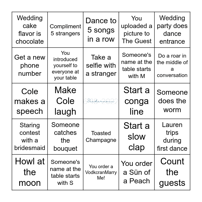 This bingo card has a free space and 75 words: Find the bridesmaid who is left handed, Dance with Elke (MOG), Dance to 5 songs in a row, Sparkler Tunnel, You see a wild animal, You high five someone at another table, You signed the guestbook, Bridesmaid changes their shoes, Start the wave, You got on the dance floor, DJ plays YMCA, Someone shotguns a beer, Take a selfie with a stranger, Get a new phone number, DJ plays Sweet Caroline, Make Cole laugh, You played cornhole, Count the guests, No one catches the bouquet, Wedding party does dance entrance, Cole dances with Whitney(MOB), Cole makes a speech, You introduced yourself to everyone at your table, Compliment 5 strangers, You uploaded a picture to The Guest, Sing while using the bathroom, DJ plays Dancing Queen, Someone's name at the table starts with L, Cake smashed in face, Someone did a cartwheel, Wedding cake flavor is vanilla, Attempt to do a magic trick, Take a picture of the best outfit, Start a slow clap, Do a roar in the middle of a conversation, Someone's name at the table starts with M, Someone does the splits, Fist bump a child, Someone does the worm, You order a Sün of a Peach, DJ plays Low by FloRida, Two people are wearing the same outfit, Elke (MOG) dances on the dance floor, Dad joke is told, Lauren choreographs a dance to Blinding Lights, Megan (MOH) cries during toast, Howl at the moon, Wedding cake flavor is chocolate, Someone does the robot, You see a party animal, Do the worm, Toasted Champagne, James (Best Man) does a shot with Barry (FOB), Do the robot, DJ plays Cupid Shuffle, Someone's name at the table starts with C, You had a glass of wine, DJ plays Cotton Eye Joe, Flashmob dance, You dance with a member of the wedding party, Someone catches the bouquet, You ask someone at another table to dance, Have a drink with Lauren, Barry(FOB) is nicknamed "Dancing Barry", Child cries, Start a conga line, Find a guest that speaks German, Silly face photo with your whole table, Barry (FOB) cries during toast, Lauren trips during first dance, Staring contest with a bridesmaid, Someone's name at the table starts with S, Sit at every table, You order a VodkcranMarry Me! and Someone spills their drink.