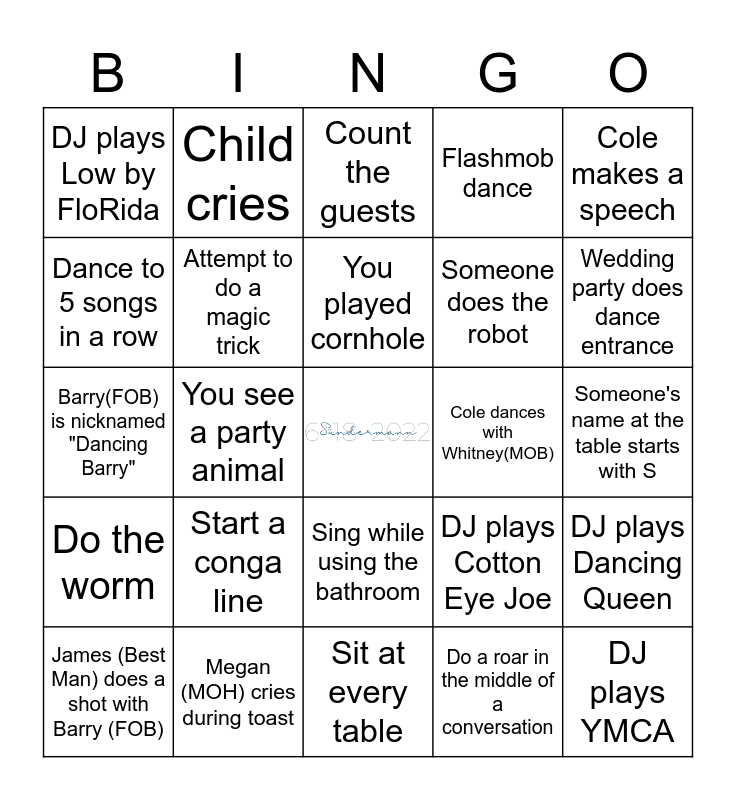 This bingo card has a free space and 75 words: Barry (FOB) cries during toast, Someone catches the bouquet, Count the guests, No one catches the bouquet, You order a VodkcranMarry Me!, Fist bump a child, You see a wild animal, Howl at the moon, Wedding cake flavor is vanilla, You ask someone at another table to dance, Someone did a cartwheel, Someone does the splits, You played cornhole, Dance to 5 songs in a row, Toasted Champagne, You see a party animal, Wedding cake flavor is chocolate, DJ plays YMCA, Find a guest that speaks German, Cole makes a speech, You uploaded a picture to The Guest, Barry(FOB) is nicknamed "Dancing Barry", Attempt to do a magic trick, Child cries, Flashmob dance, Someone shotguns a beer, Make Cole laugh, Start the wave, Someone does the worm, Lauren trips during first dance, Cake smashed in face, Someone's name at the table starts with L, DJ plays Cupid Shuffle, DJ plays Cotton Eye Joe, Wedding party does dance entrance, Someone does the robot, Take a picture of the best outfit, Do the robot, Someone's name at the table starts with S, Do a roar in the middle of a conversation, Two people are wearing the same outfit, DJ plays Sweet Caroline, Start a slow clap, Dance with Elke (MOG), Bridesmaid changes their shoes, Take a selfie with a stranger, James (Best Man) does a shot with Barry (FOB), DJ plays Low by FloRida, Dad joke is told, You introduced yourself to everyone at your table, You got on the dance floor, Sing while using the bathroom, Lauren choreographs a dance to Blinding Lights, Get a new phone number, Someone's name at the table starts with M, You had a glass of wine, You signed the guestbook, You dance with a member of the wedding party, Elke (MOG) dances on the dance floor, Have a drink with Lauren, Start a conga line, Find the bridesmaid who is left handed, You order a Sün of a Peach, Sparkler Tunnel, Someone spills their drink, Cole dances with Whitney(MOB), Silly face photo with your whole table, Staring contest with a bridesmaid, You high five someone at another table, DJ plays Dancing Queen, Do the worm, Megan (MOH) cries during toast, Someone's name at the table starts with C, Sit at every table and Compliment 5 strangers.