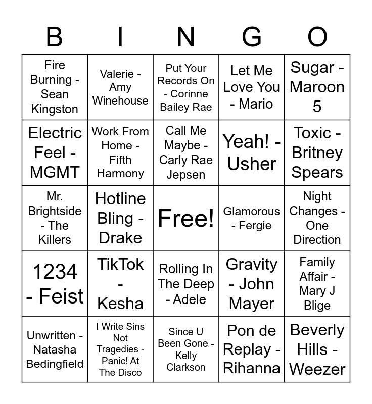 This bingo card has a free space and 28 words: Family Affair - Mary J Blige, Just Dance - Lady Gaga, Yeah! - Usher, Pon de Replay - Rihanna, Electric Feel - MGMT, Put Your Records On - Corinne Bailey Rae, Valerie - Amy Winehouse, 1234 - Feist, Glamorous - Fergie, Unwritten - Natasha Bedingfield, Mr. Brightside - The Killers, Let Me Love You - Mario, I Write Sins Not Tragedies - Panic! At The Disco, Since U Been Gone - Kelly Clarkson, Toxic - Britney Spears, Our Song - Taylor Swift, TikTok - Kesha, Work From Home - Fifth Harmony, Call Me Maybe - Carly Rae Jepsen, Rolling In The Deep - Adele, Fire Burning - Sean Kingston, We Belong Together - Mariah Carey, Beverly Hills - Weezer, Hotline Bling - Drake, Night Changes - One Direction, Gravity - John Mayer, Sugar - Maroon 5 and I Gotta Feeling - Black Eyed Peas.