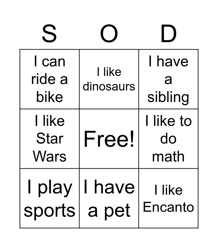 This bingo card has a free space and 10 words: I have a pet, I have a sibling, I can ride a bike, I like Encanto, I like Star Wars, I play sports, I like dinosaurs, I like to read, I like to do math and I can swim.