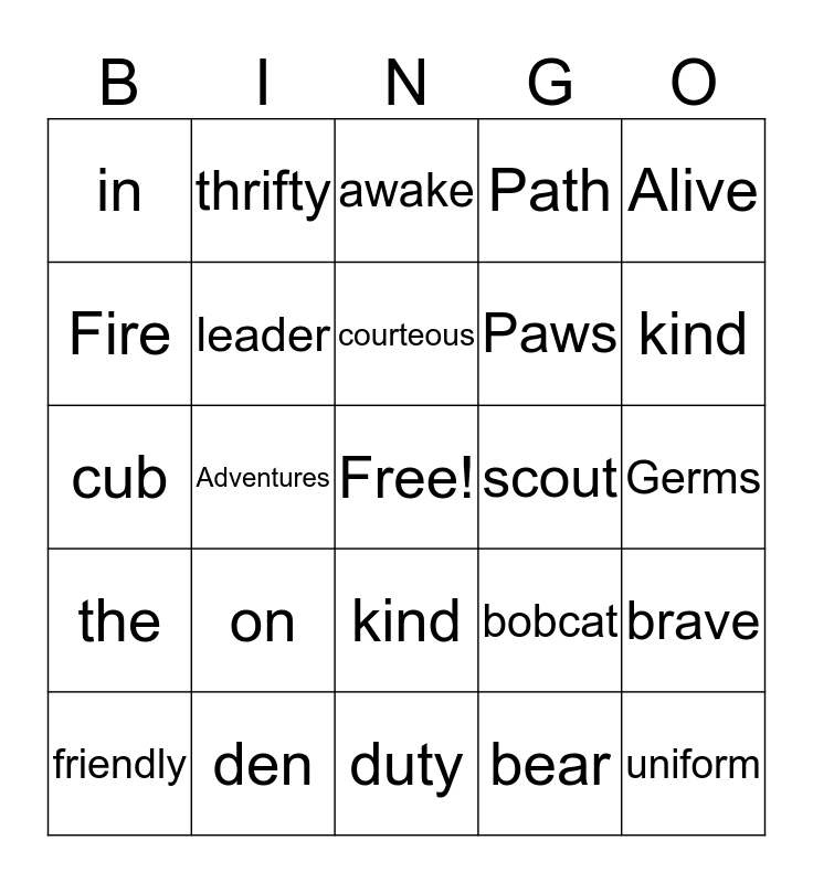 This bingo card has a free space and 64 words: clean, loyal, trustworthy, brave, cheerful, obedient, thrifty, reverent, courteous, helpful, kind, friendly, Germs, Alive, Council, Fire, Adventures, in, Coins, Paws, on, the, Path, Code, clean, loyal, trustworthy, brave, cheerful, obedient, thrifty, reverent, courteous, helpful, kind, friendly, wolf, bear, webelo, leader, cub, scout, oath, law, pack, uniform, den, character, bobcat, honor, best, God, duty, country, strong, straight, awake, sign, handshake, salute, motto, rank, adventure and cubmaster.