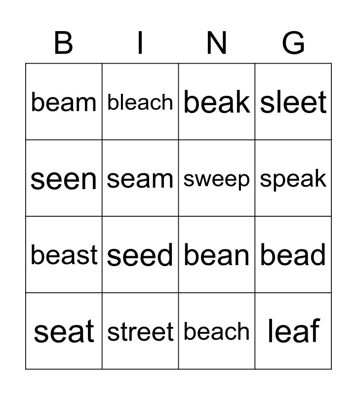This bingo card has 16 words: street, bead, beak, beam, beast, bleach, bean, beach, seen, seam, seat, sleet, seed, speak, sweep and leaf.