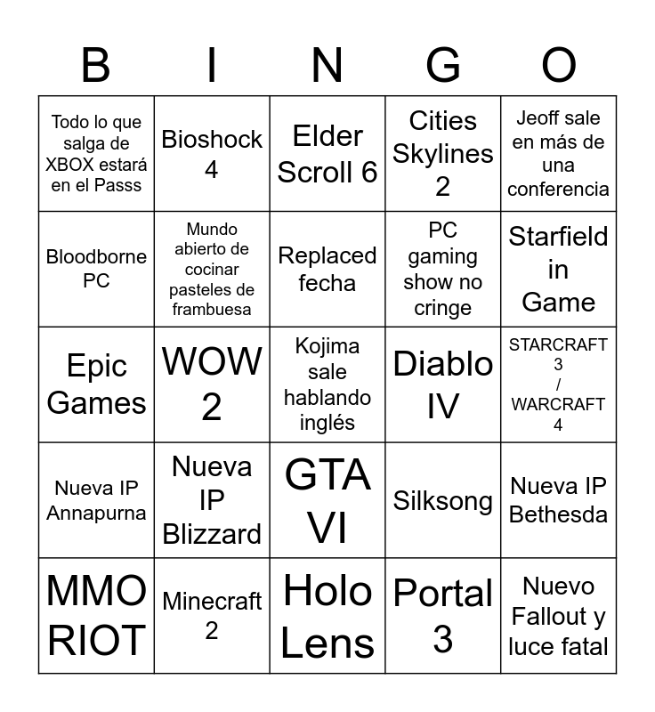 This bingo card has 25 words: Nueva IP Blizzard, Holo Lens, Replaced fecha, MMO RIOT, Jeoff sale en más de una conferencia, Todo lo que salga de XBOX estará en el Passs, Bloodborne PC, Bioshock 4, Diablo IV, GTA VI, PC gaming show no cringe, Epic Games, Silksong, Nueva IP Bethesda, Mundo abierto de cocinar pasteles de frambuesa, Nuevo Fallout y luce fatal, STARCRAFT 3 / WARCRAFT 4, Elder Scroll 6, Starfield in Game, WOW 2, Kojima sale hablando inglés, Minecraft 2, Nueva IP Annapurna, Cities Skylines 2 and Portal 3.