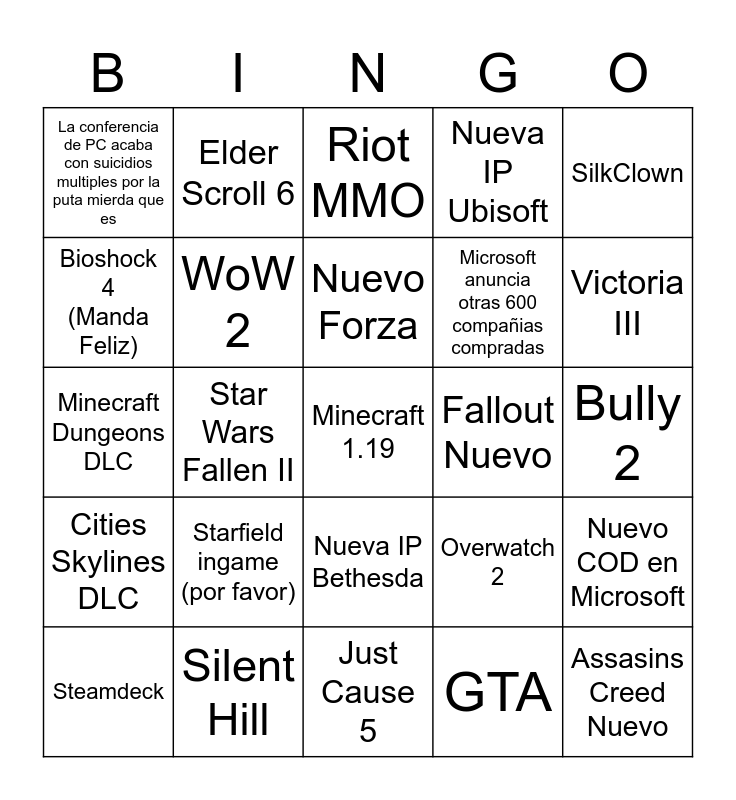 This bingo card has a free space and 24 words: Starfield ingame (por favor), Silent Hill, Nuevo Forza, Steamdeck, SilkClown, La conferencia de PC acaba con suicidios multiples por la puta mierda que es, Bioshock 4 (Manda Feliz), Elder Scroll 6, Fallout Nuevo, Nueva IP Bethesda, Microsoft anuncia otras 600 compañias compradas, Minecraft Dungeons DLC, Overwatch 2, Nuevo COD en Microsoft, WoW 2, GTA, Bully 2, Riot MMO, Victoria III, Star Wars Fallen II, Assasins Creed Nuevo, Cities Skylines DLC, Nueva IP Ubisoft and Just Cause 5.