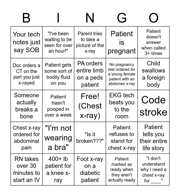 This bingo card has a free space and 24 words: "I'm not wearing a bra", 400+ lb patient for a knee x-ray, PA orders entire limb on a peds patient, RN takes over 30 minutes to start an IV, Patient doesn't answer when called 3+ times, Your tech notes just say SOB, Doc orders a CT on the part you just x-rayed, "I've been waiting to be seen for over an hour!", EKG tech beats you to the room, "Is it broken???", No pregnancy test ordered for a young female patient with an abdomen x-ray, Someone actually breaks a bone, Patient refuses to stand for chest x-ray, Patient tells you their entire life story, Patient gets some sort of bodily fluid on you, Patient marked as ready when they aren't actually ready, Code stroke, Parent tries to take a picture of the x-ray, Child swallows a foreign body, Patient hasn't pooped in over a week, "I don't understand why I need a chest x-ray for ____", Chest x-ray ordered for abdominal pain, Patient is pregnant and Foot x-ray on a diabetic patient.