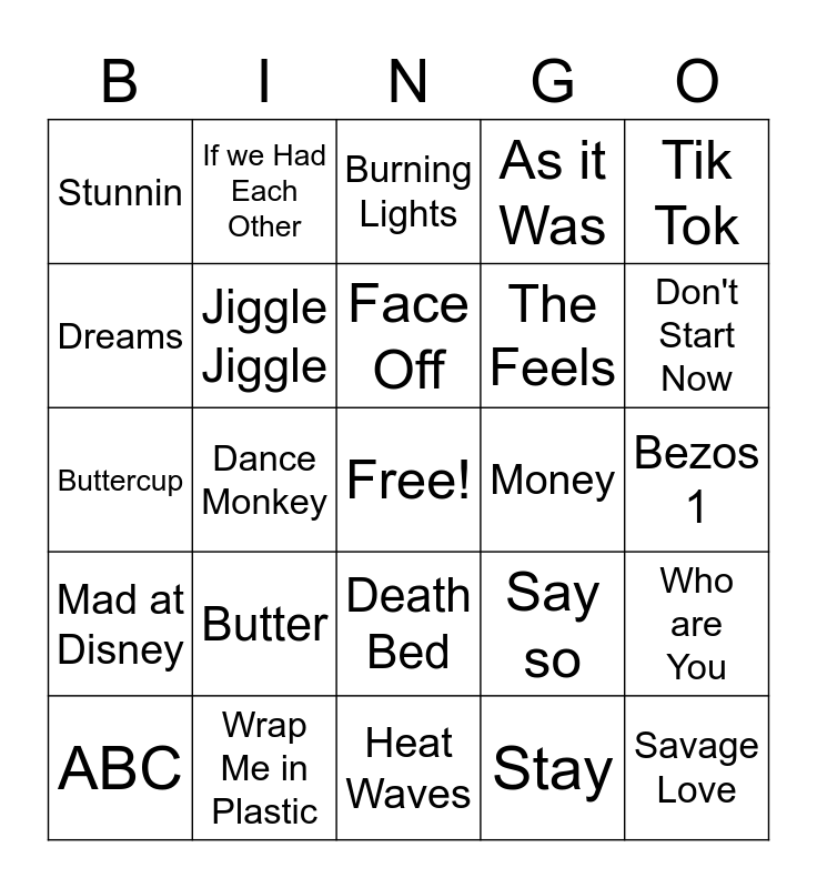 This bingo card has a free space and 24 words: Butter, Wrap Me in Plastic, Face Off, ABC, Tik Tok, Stunnin, Dreams, If we Had Each Other, Money, Death Bed, The Feels, Buttercup, Say so, Who are You, Jiggle Jiggle, Stay, Bezos 1, Burning Lights, Don't Start Now, Dance Monkey, Savage Love, Mad at Disney, As it Was and Heat Waves.