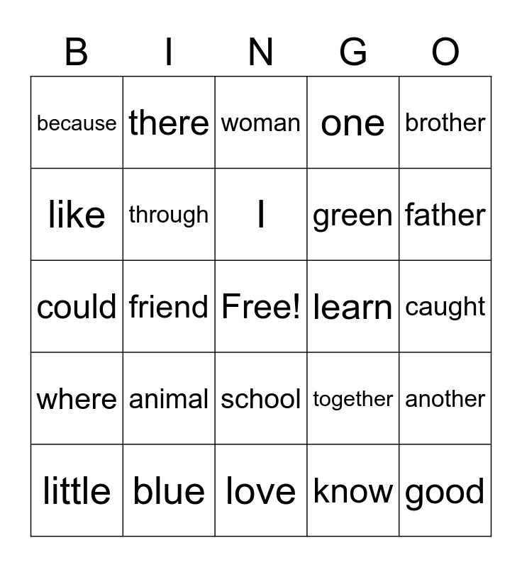 This bingo card has a free space and 24 words: animal, blue, I, little, brother, because, like, there, learn, school, green, could, together, another, through, know, caught, woman, father, friend, good, where, one and love.