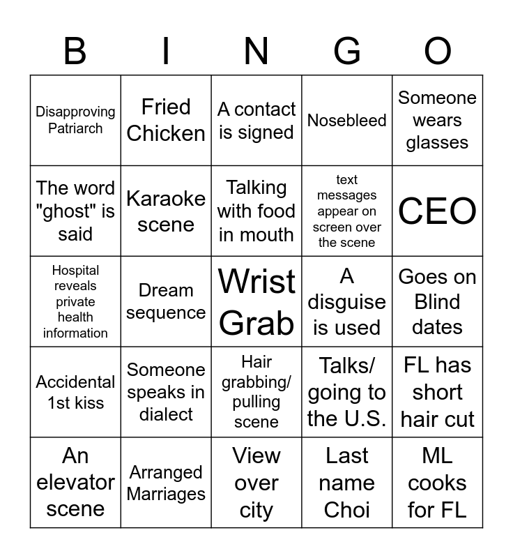 This bingo card has a free space and 24 words: Someone speaks in dialect, Arranged Marriages, Talking with food in mouth, An elevator scene, Someone wears glasses, Disapproving Patriarch, The word "ghost" is said, Fried Chicken, A disguise is used, Hair grabbing/ pulling scene, text messages appear on screen over the scene, Hospital reveals private health information, Talks/ going to the U.S., FL has short hair cut, Karaoke scene, Last name Choi, Goes on Blind dates, A contact is signed, CEO, Dream sequence, ML cooks for FL, Accidental 1st kiss, Nosebleed and View over city.