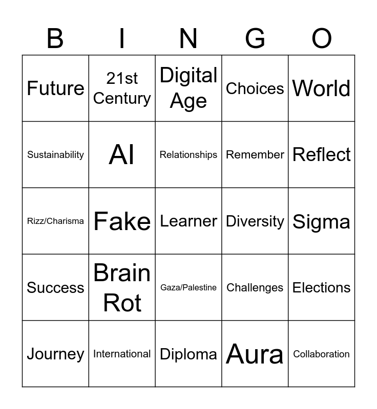 This bingo card has a free space and 34 words: Achievement, Aura, Gen Alpha, Tolerance, Success, AI, World, Journey, 21st Century, Chat GPT, Relationships, Digital Age, Conflict, Hurdle, Diversity, Reflect, International, Rizz/Charisma, Brain Rot, Challenges, Gaza/Palestine, Tik Tok, Future, Sigma, Diploma, Collaboration, Choices, Hard work, Remember, Sustainability, Wellness, Fake, Elections and Assessments.