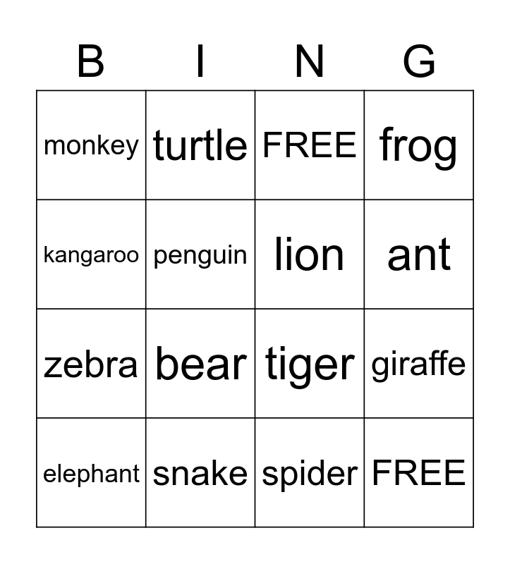 This bingo card has 16 words: snake, giraffe, FREE, monkey, zebra, turtle, tiger, spider, kangaroo, penguin, elephant, frog, bear, ant, lion and FREE.