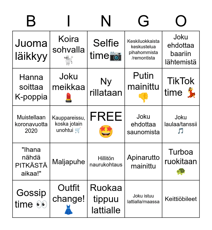 This bingo card has a free space and 24 words: Maljapuhe, Outfit change!👗, Ny rillataan, Gossip time 👀, Joku ehdottaa baariin lähtemistä, Juoma läikkyy, Hanna soittaa K-poppia, Koira sohvalla 🐩, Joku ehdottaa saunomista, Hillitön naurukohtaus, Putin mainittu 👎, Muistellaan koronavuotta 2020, Apinarutto mainittu, Turboa ruokitaan 🐢, Joku meikkaa 💄, Joku istuu lattialla/maassa, Joku laulaa/tanssii 🎵, Selfie time📷, TikTok time 💃, Kauppareissu, koska jotain unohtui 🛒, Keittiöbileet, "Ihana nähdä PITKÄSTÄ aikaa!", Keskiluokkaista keskustelua pihahommista /remontista and Ruokaa tippuu lattialle.